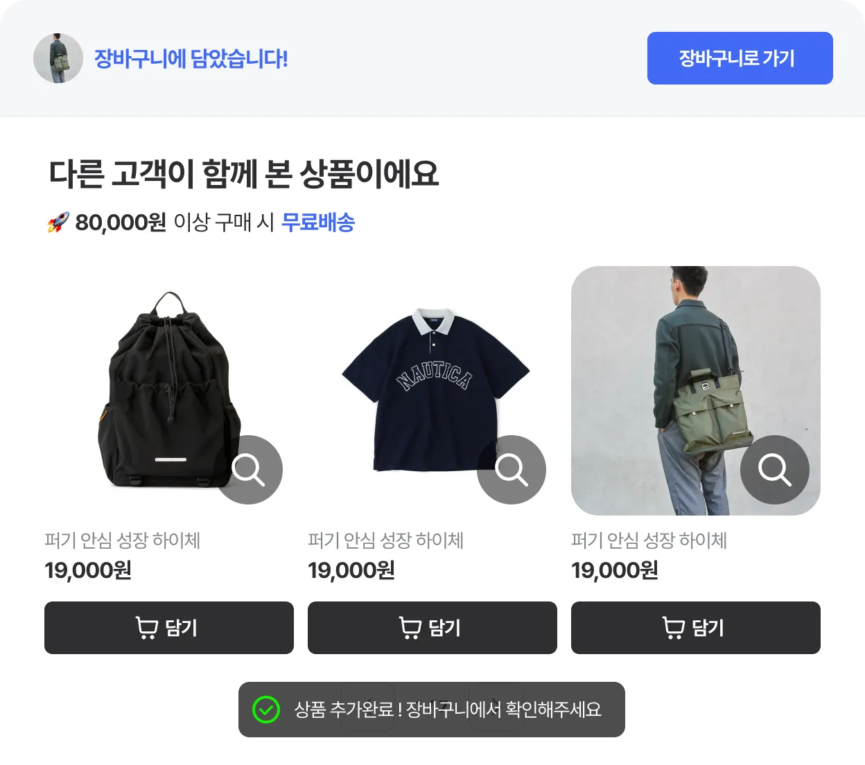 상품을 구매하는 순간까지 다른 상품을 추천해서 추가 구매를 유도하는 위젯