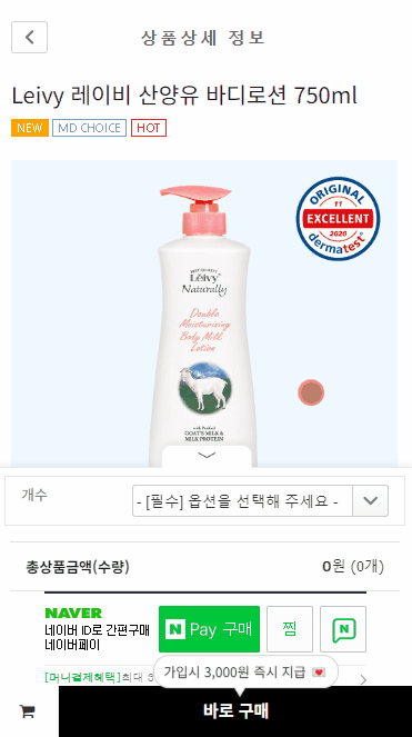 적용 위치: 상품 상세페이지에서 구매/장바구니 버튼 클릭 시 팝업 형태로 노출