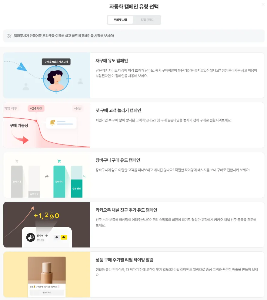 알파 푸시가 만들어 둔 프리셋을 통해 쉽고 빠르게 캠페인을 시작해 보세요!