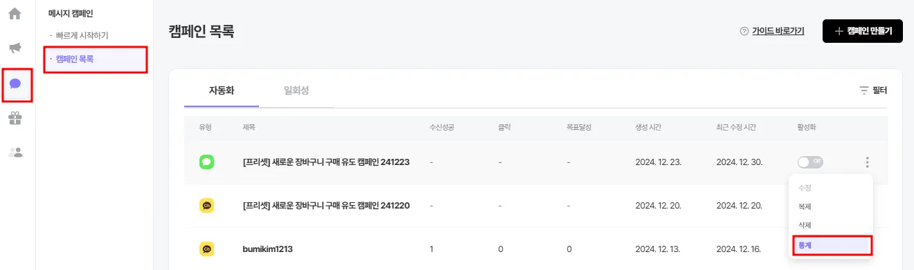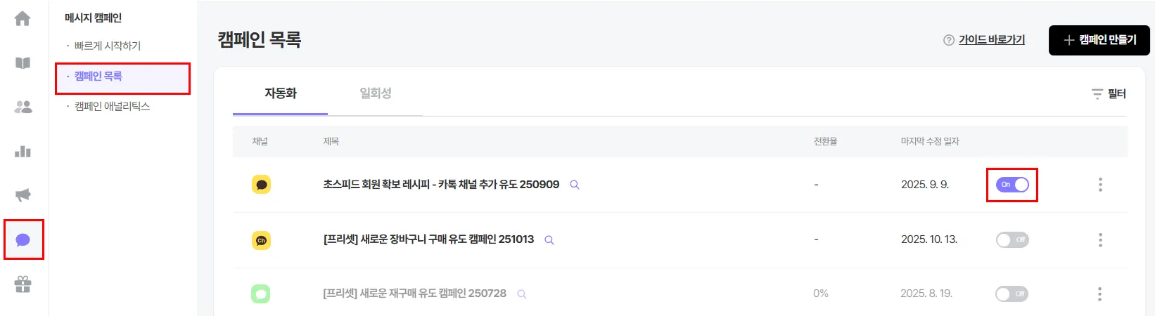 생성 된 캠페인은 [메시지캠페인 > 캠페인 목록]에서 활성화/비활성화 설정이 가능합니다