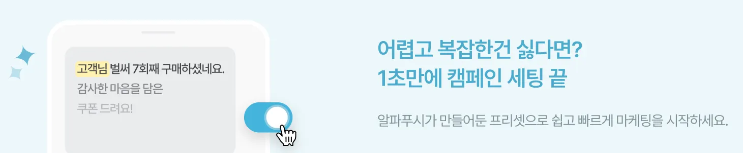 알파푸시에서 제공하는 오프사이트 캠페인을 통해 특정 조건의 고객에게 쿠폰을 담아 문자 메세지와 친구톡을 자동으로 발송할 수 있어요!