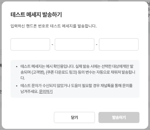 설정이 완료 된 후 오른쪽 상단 테스트 메세지를 발송을 눌러 테스트 메세지를 발송해보세요!