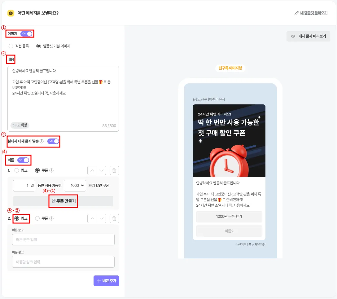 쿠폰 설정 시 다운로드 링크가 메시지에 자동으로 입력 됩니다