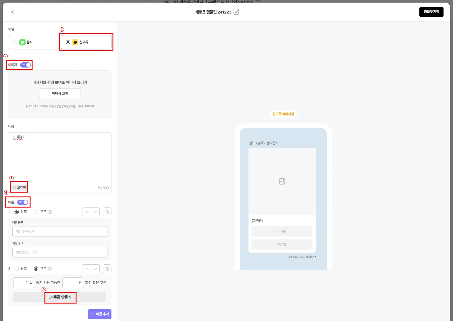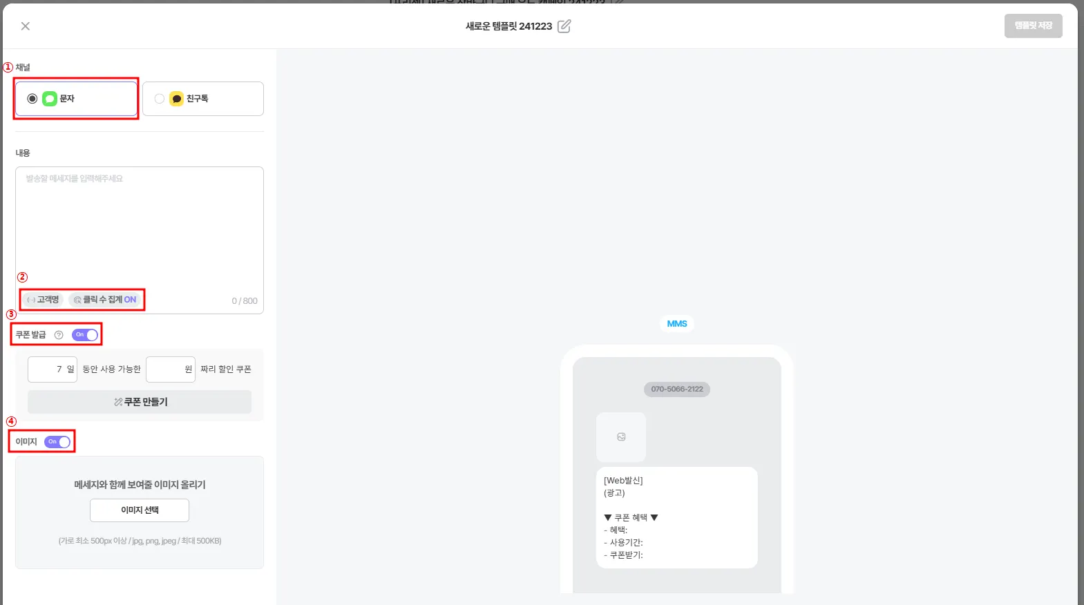 쿠폰 설정 시 다운로드 링크가 메시지에 자동으로 입력 됩니다