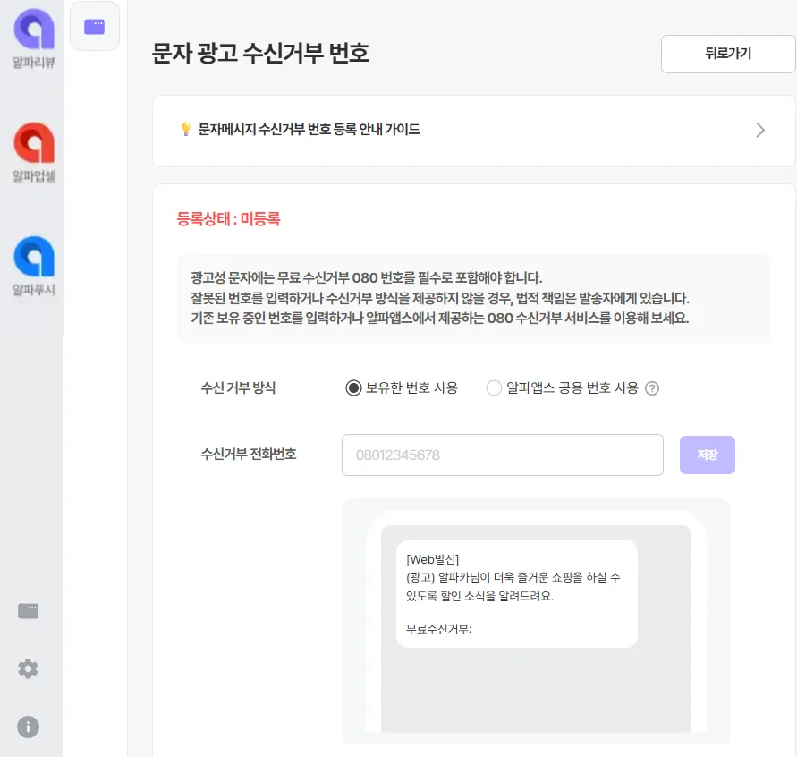 문자 발신 번호와 문자 광고 수신 거부 번호를 모두 등록해주셔야 기능을 정상적으로 사용 하실 수 있습니다