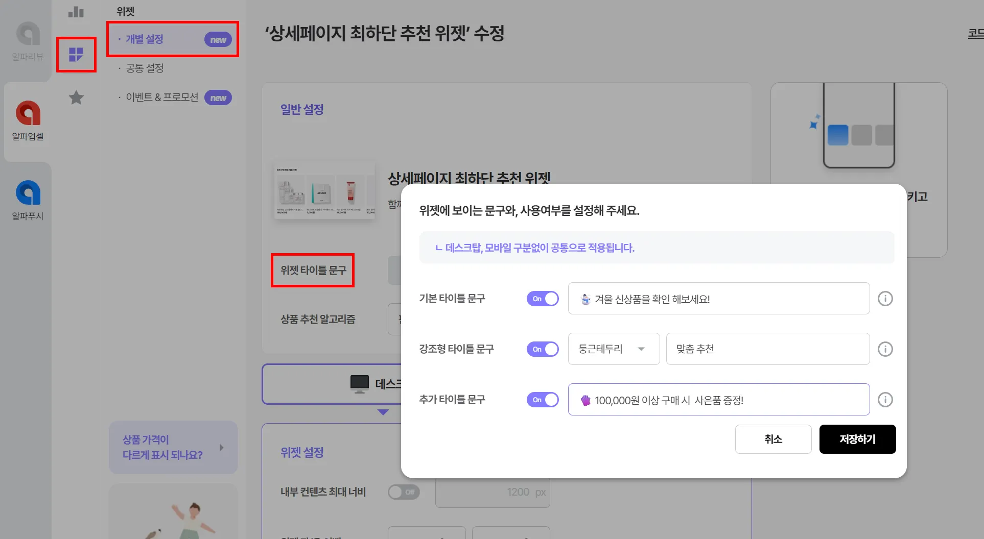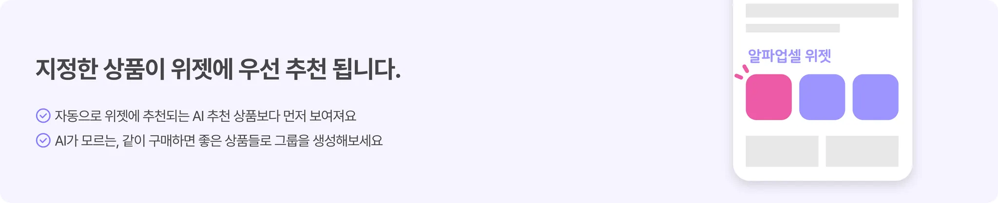알파업셀의 위젯은 [상세페이지/장바구니 페이지/메인페이지]로 각 위젯의 설치 위치가 고정되어있기 때문에