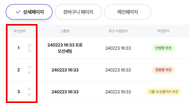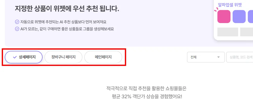 예를 들어 상세페이지 하단 위젯을 2개 설치 하고, 상단에서는 AI 추천이 적용 되도록 두고