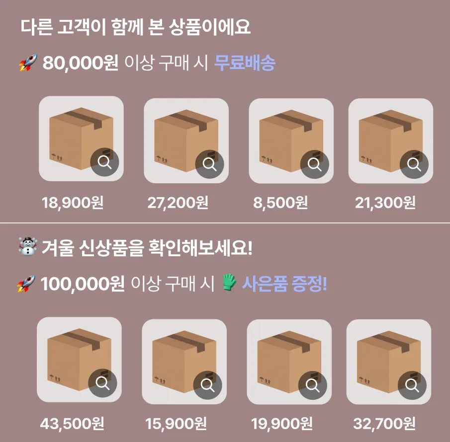 2번째 위젯에서는 “겨울 신상품”만 추천 되도록 추천 위젯을 지정하면? 오른쪽 이미지와 같이 각각의 위젯에서 다른 상품들이 추천 됩니다