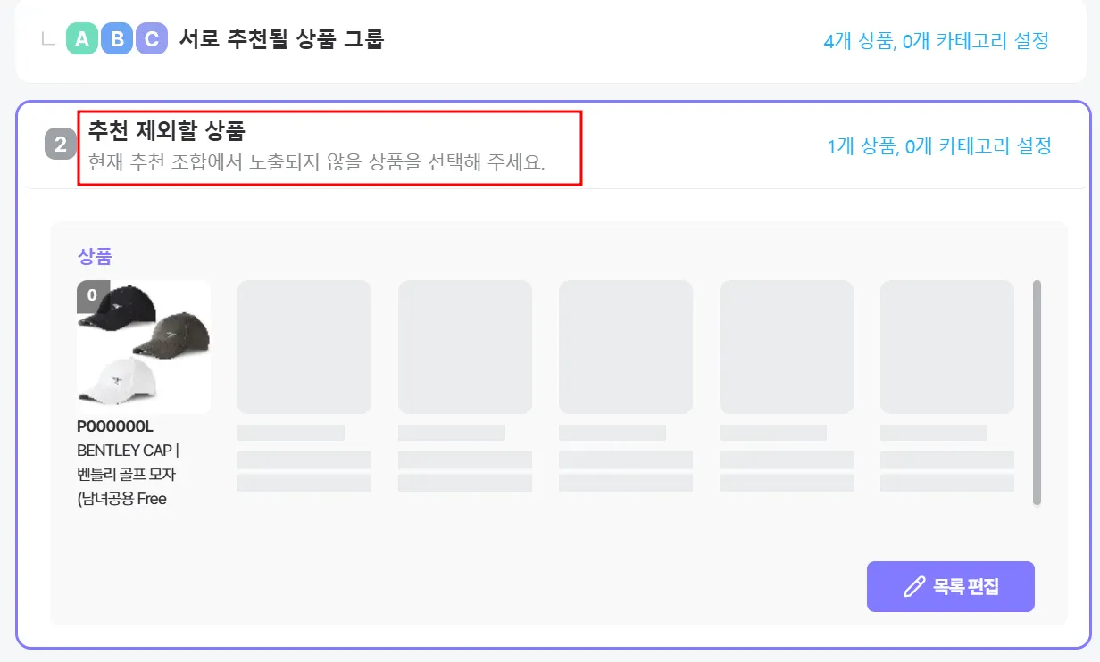 AI 추천 기능이 활성화 되어있는 경우 AI 추천으로 인해 제외 된 상품이 보여질 수 있습니다