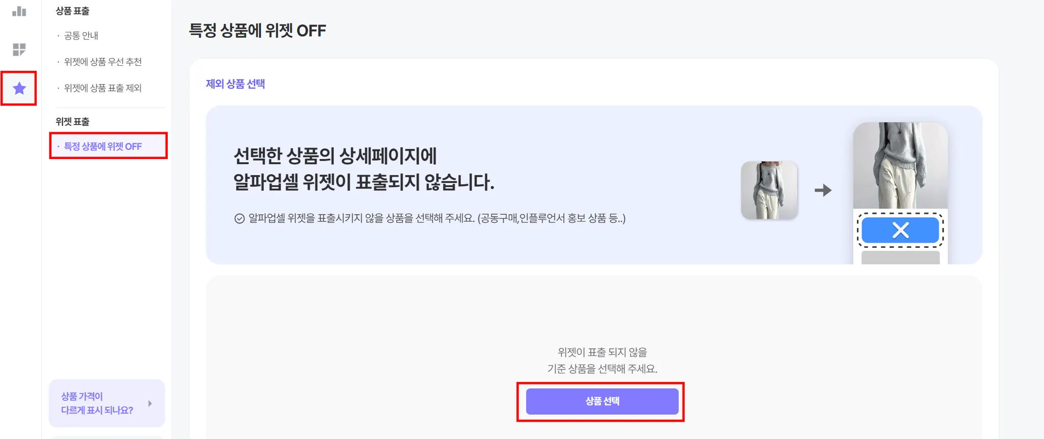 위젯 OFF: A 상품 설정 시 A 상품의 상세페이지에서만 알파업셀 위젯이 노출되지 않음