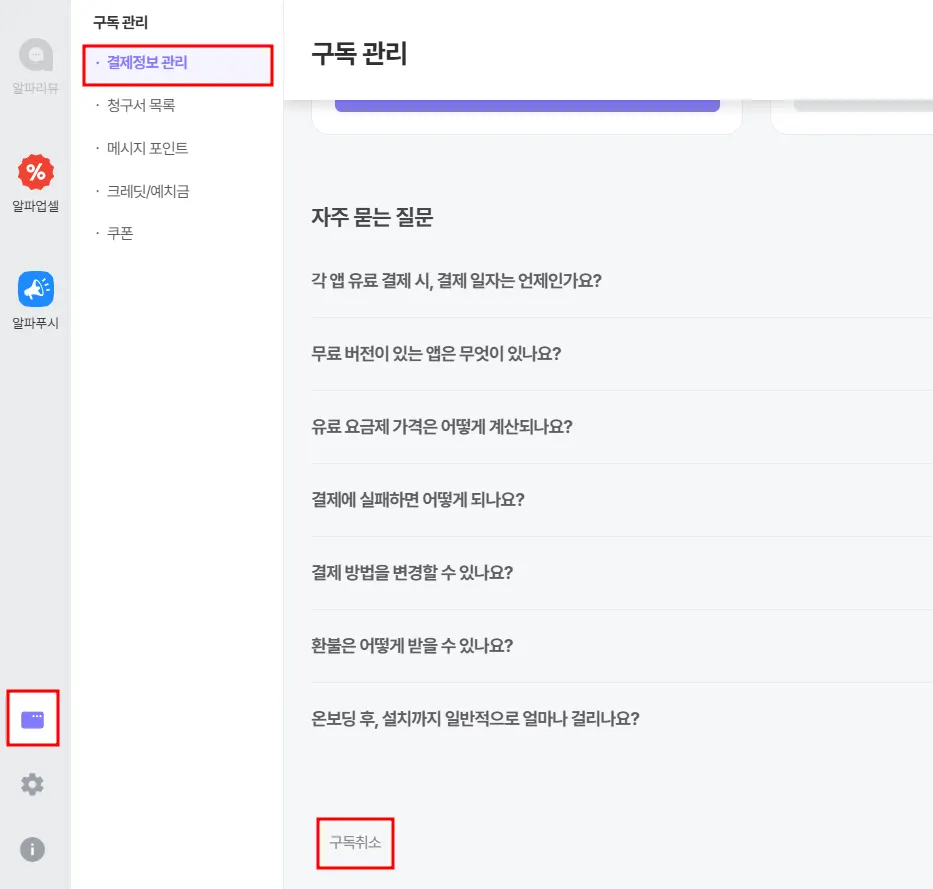 접속 경로: 구독 설정 > 결제정보 관리 > 구독취소