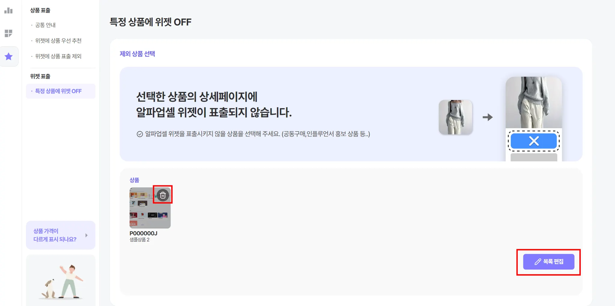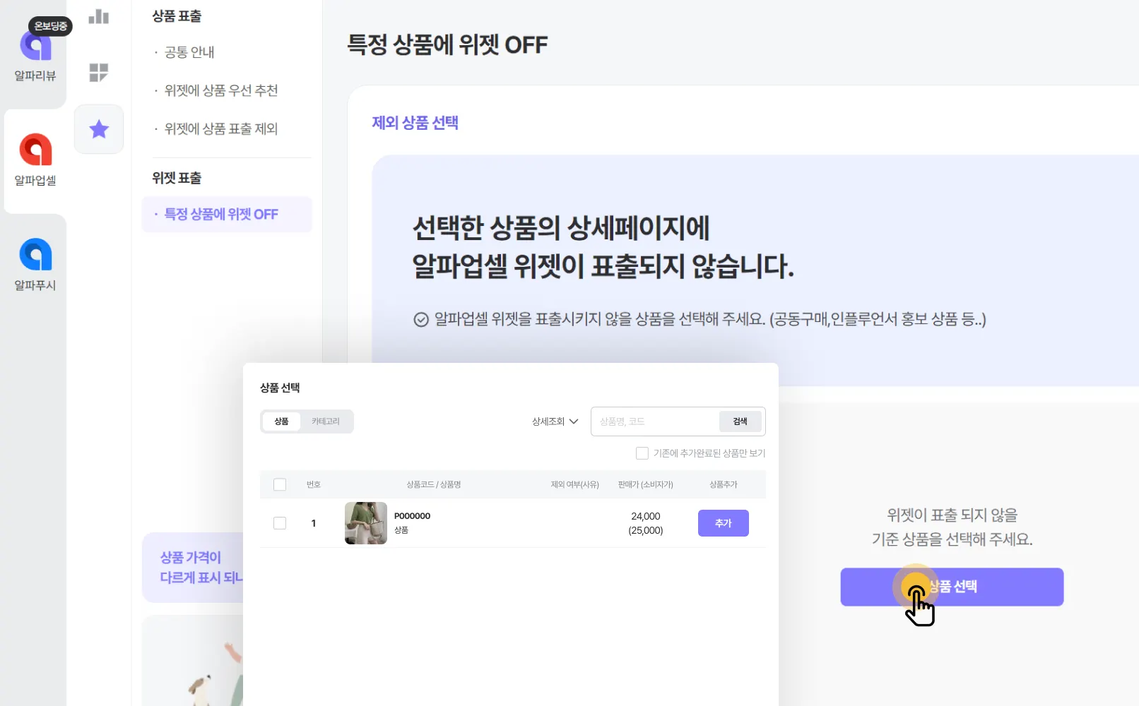 비밀 링크, 정기 구독 상품, 공동 구매 상품 등 알파 업셀 위젯을 표출 시키지 않을 상품을 선택하여 미 노출 할 수 있어요