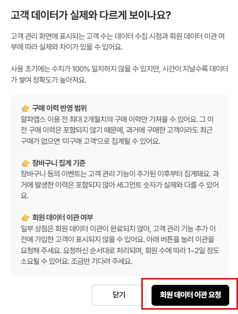 [고객 관리 > 고객 데이터가 실제와 다르게 보이나요?]에서 “회원 데이터 이관 요청”을 눌러 이관을 요청해 주세요!