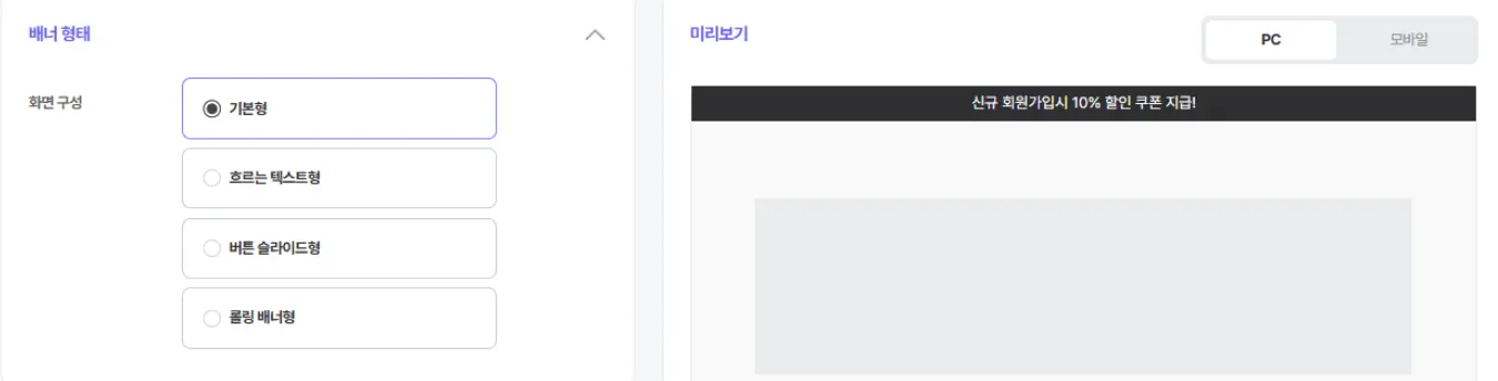 쇼핑몰 최상단에서 보여지는 형식만 제공 하며 텍스트만 등록 가능