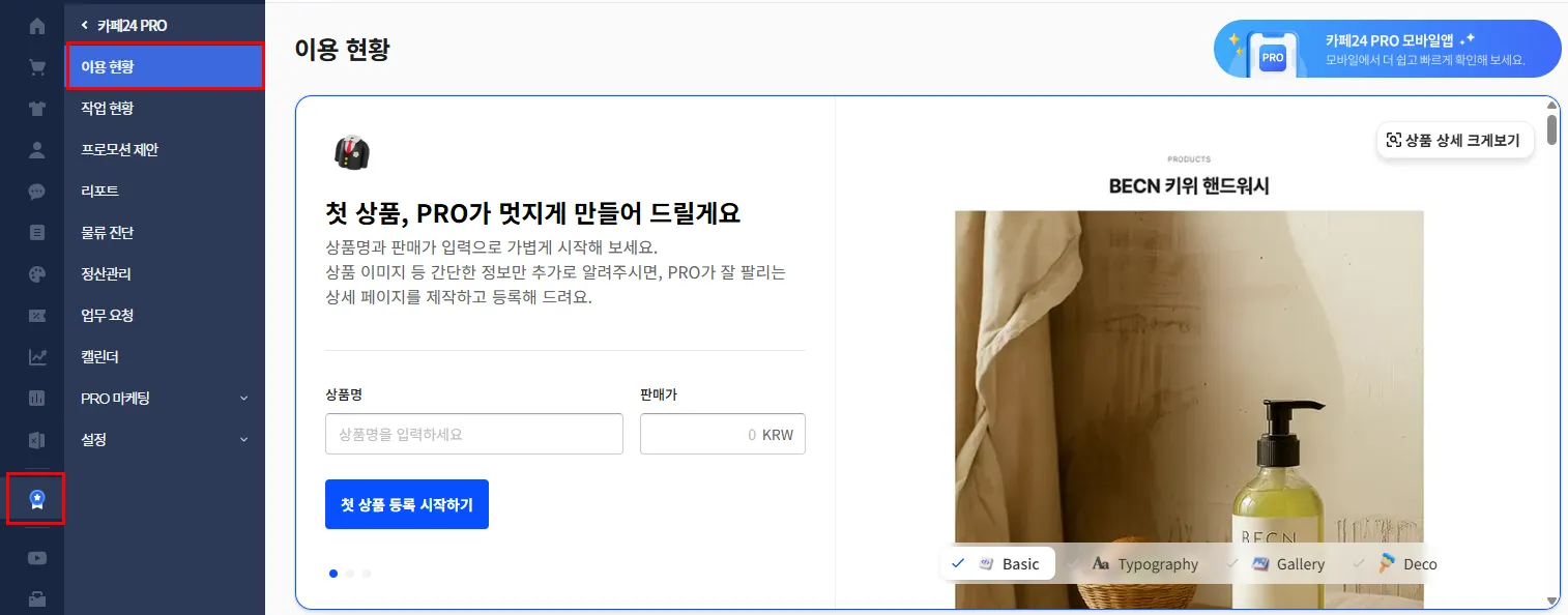 접속 경로: [카페24 대시보드 > 카페24PRO > 이용현황]