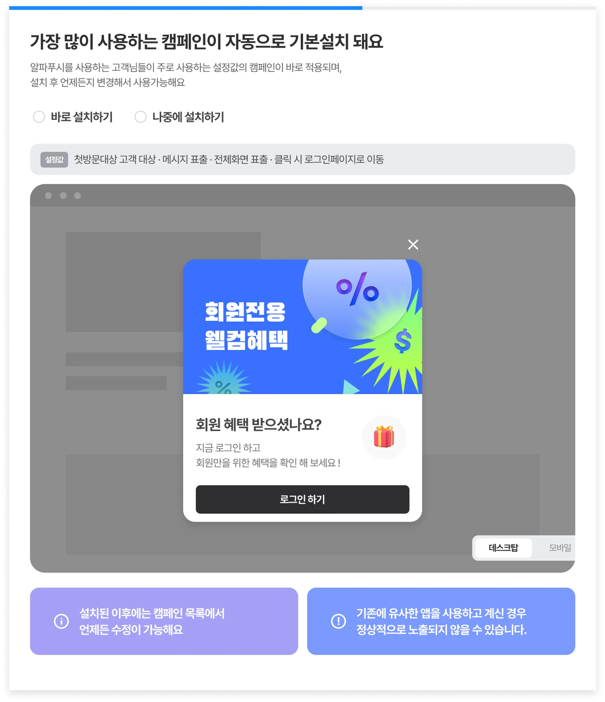 최초 설치 시점에 바로 사용하기가 아닌 나중에 설치하기를 선택하셨다면 설정 되어있는 캠페인을 활성화 해주세요