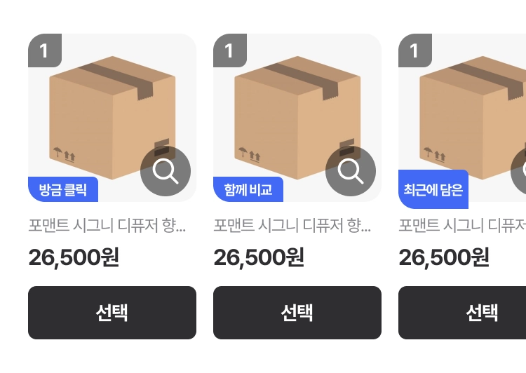 상품 썸네일에 고객의 탐색 패턴에 따라 비교 탐색 중인 상품에는 [함께 비교], 이전에 장바구니에 담았던 상품에는 [최근에 담은]태그가 표시됩니다